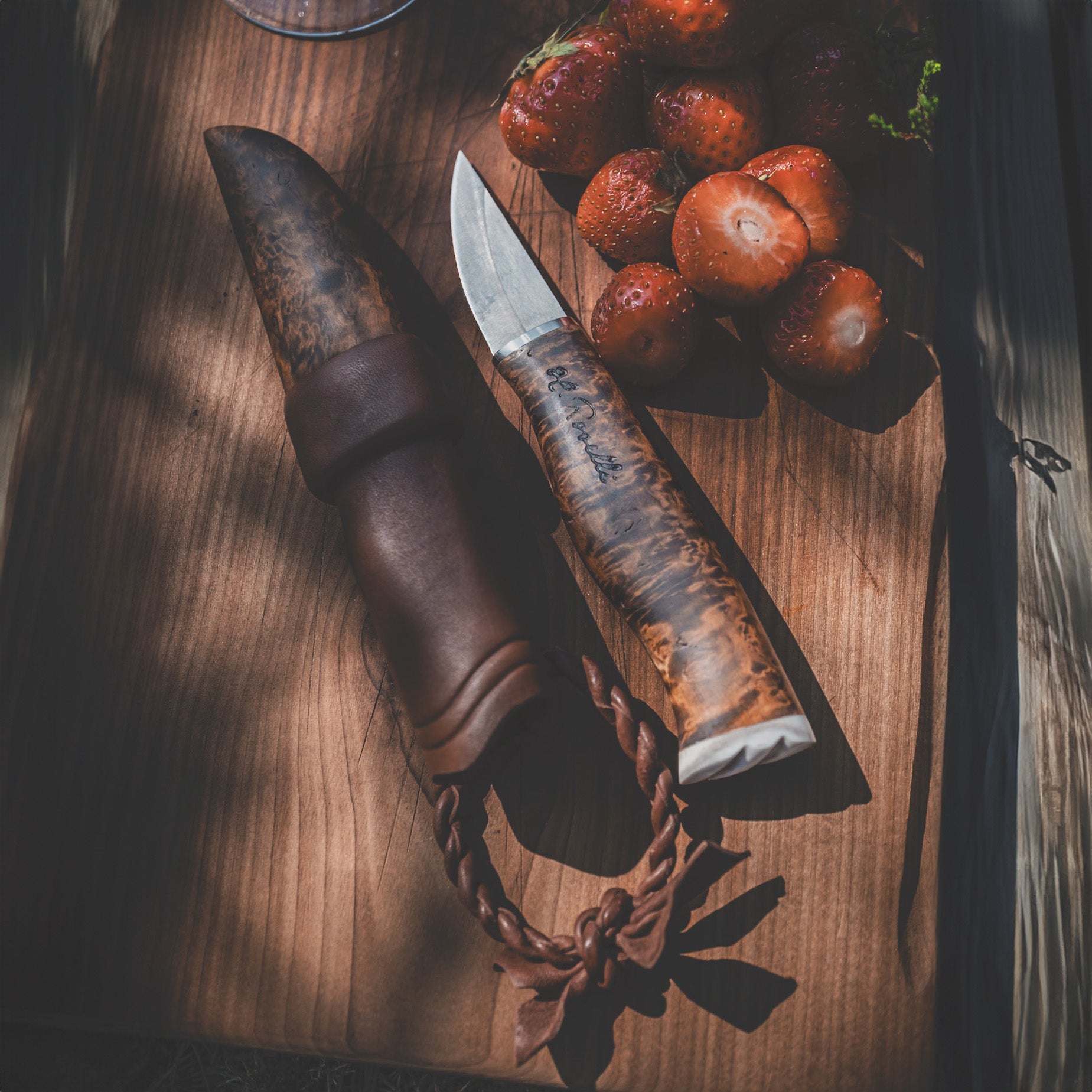 Sheath: Vegetable tanned leather & Stained curly birch